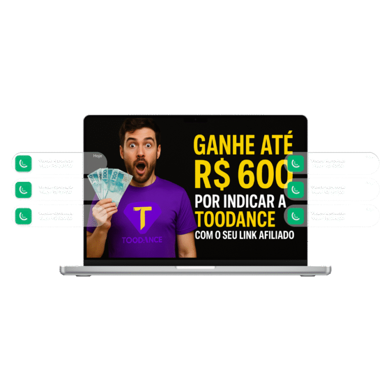 Já imaginou transformar a vida de alguém que quer viver da dança — e ainda faturar até R$ 600 por indicação, mais 10% de comissão recorrente sem precisar gravar uma aula sequer? Com a TooDance, você não precisa nem aparecer em vídeo. Basta indicar o seu link de afiliado, e a gente faz o resto. Zero esforço técnico. Comissões altas. Impacto real.