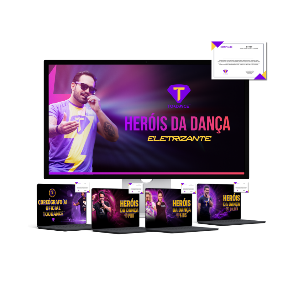 Comprove sua evolução como Herói com certificações reais e reconhecidas TooDance. Cada uma representa domínio sobre públicos e técnicas distintas. São provas práticas da sua habilidade, constância e profissionalismo no campo de batalha da dança. Certificação Heróis da Dança Eletrizante (Para fazer aulas para adultos), Certificação Heróis da Dança Kids (para fazer aulas para crianças), Certificação Heróis da Dança Melhor Idade (para fazer aulas para terceira idade), Certificação Coreógrafo Oficial TooDance, Certificação Heróis da Dança PRO (para fazer aulas online).