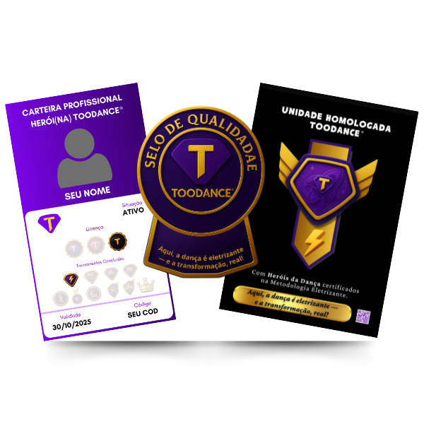 Comece com estrutura, credibilidade e o poder de uma marca que transforma. A Licença TooDance® é o primeiro passo para quem quer ministrar aulas com energia, identidade e respaldo profissional. Com ela, você garante: ✅ Autorização oficial de uso da marca TooDance® ✅ Direito de atuar como Herói da Dança credenciado ✅ Identidade visual, suporte e materiais padronizados.